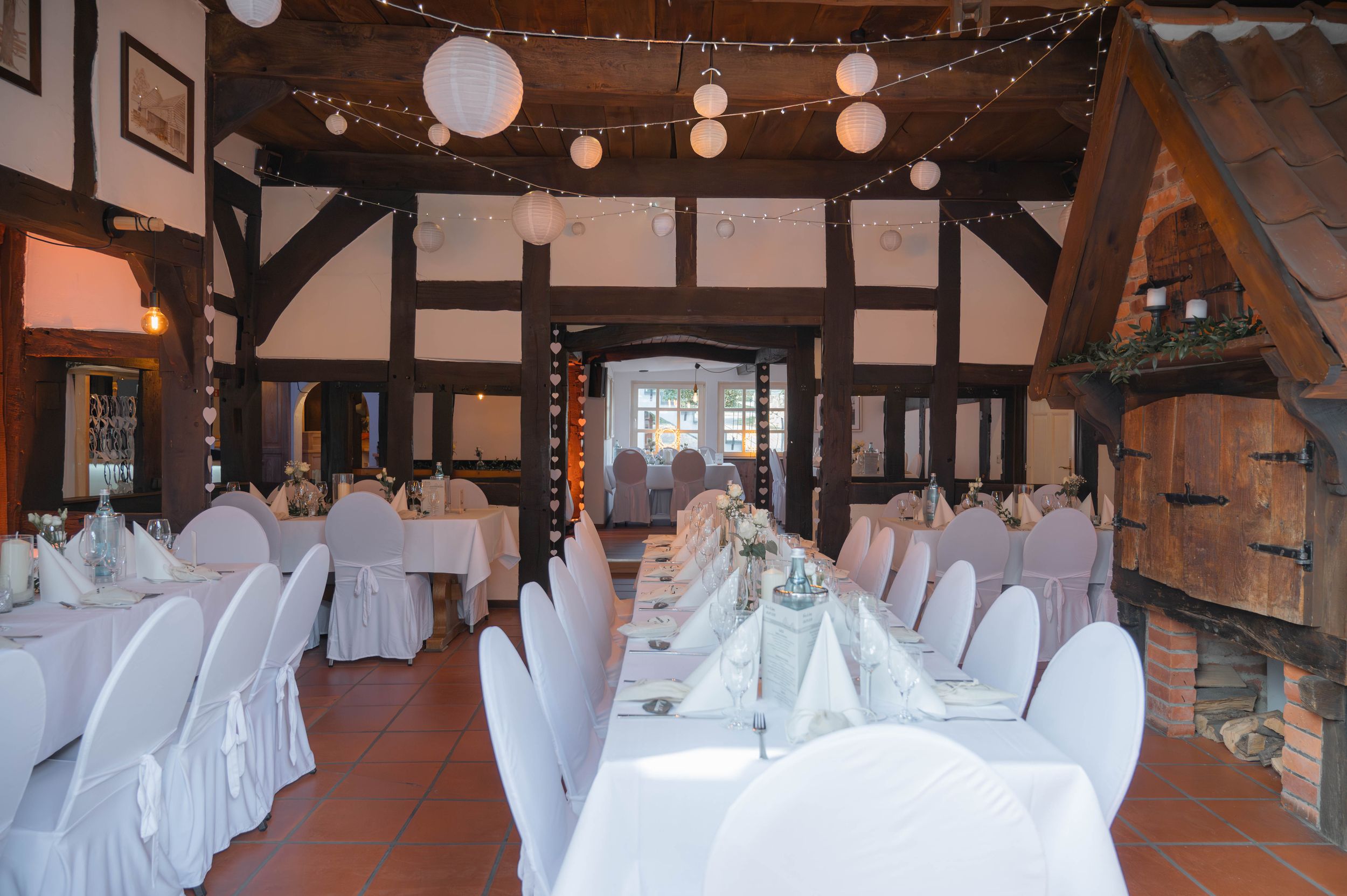 - Hochzeiten: Der Saal kann festlich mit Bankettbestuhlung, Stuhlhussen und Tischdecken dekoriert werden. Eine Verbindung zum angrenzenden Festsaal schafft zusätzlichen Raum für größere Gesellschaften.